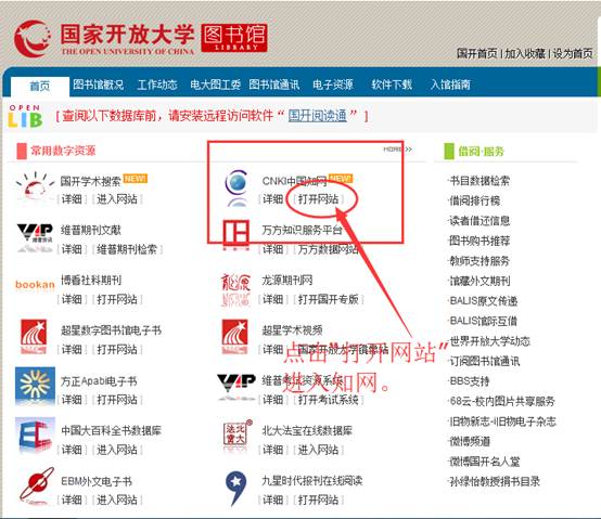 3.登录后国开阅读通会自动弹出国家开放大学图书馆网站,点击网站页面中的CNKI中国知网,打开知网网站。