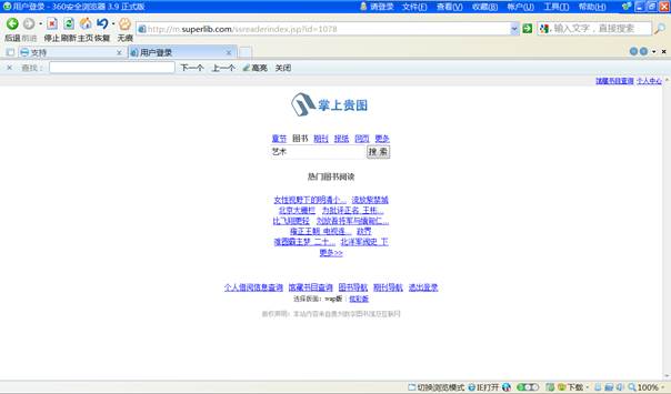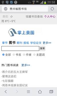由贵州省图书馆开通的手机图书馆——“掌上贵图”(网址:http://m.superlib.com/1078),是西南地区首家开通的省级移动图书馆。它将贵州数字图书馆丰富资源通过移动终端(手机、平板电脑等设备)为广大用户提供随时、随身、个性化、三网无缝链接的数字图书馆服务。