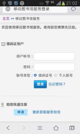 短信快速注册是针对手机访问移动图书馆时使用。短信快速注册如图3只需把个人手机号和邮箱填入并点击申请即可完成,随即会收到一个链接地址,这个地址就是个人以后访问移动图书馆的网络地址。注:这个链接地址是唯一的,不能用另外一部手机进行访问.