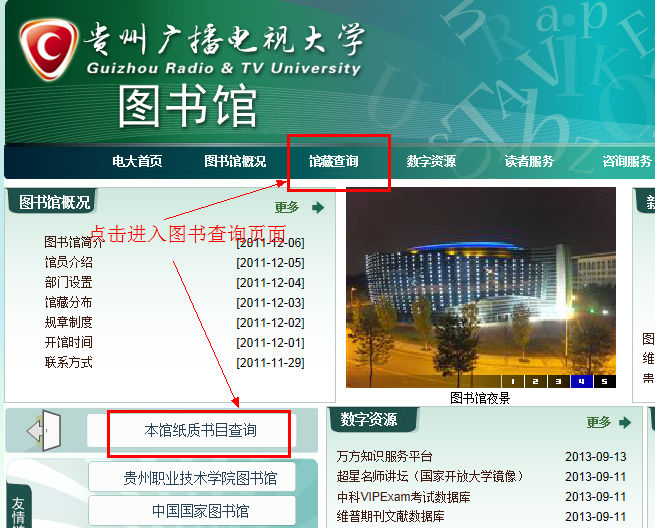 1.进入贵州广播电视大学图书馆主页后,点击本馆纸质书目查(馆藏查询亦可)或者在金阳校区图书馆内点击查询机上的书目查询进入图书检索页面。
