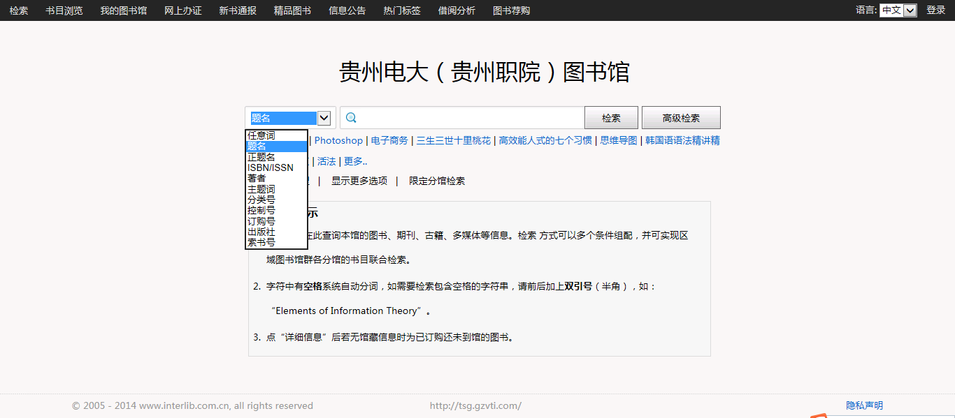 2.选择检索途径(题名、责任者、主题词等),在检索框内输入相应的检索内容,并点击查询按钮。
