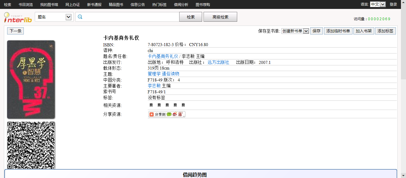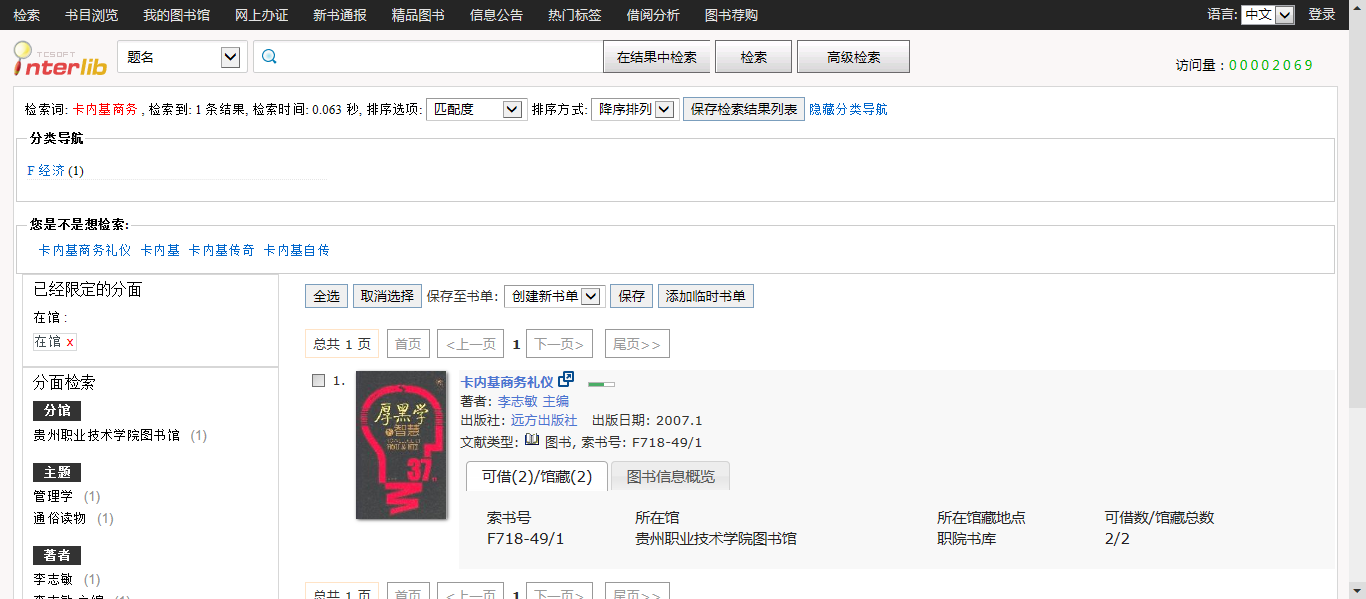 3.选中所需图书后打开详细信息,查看图书状态(馆藏地点、是否在馆),在馆状态方可借阅。