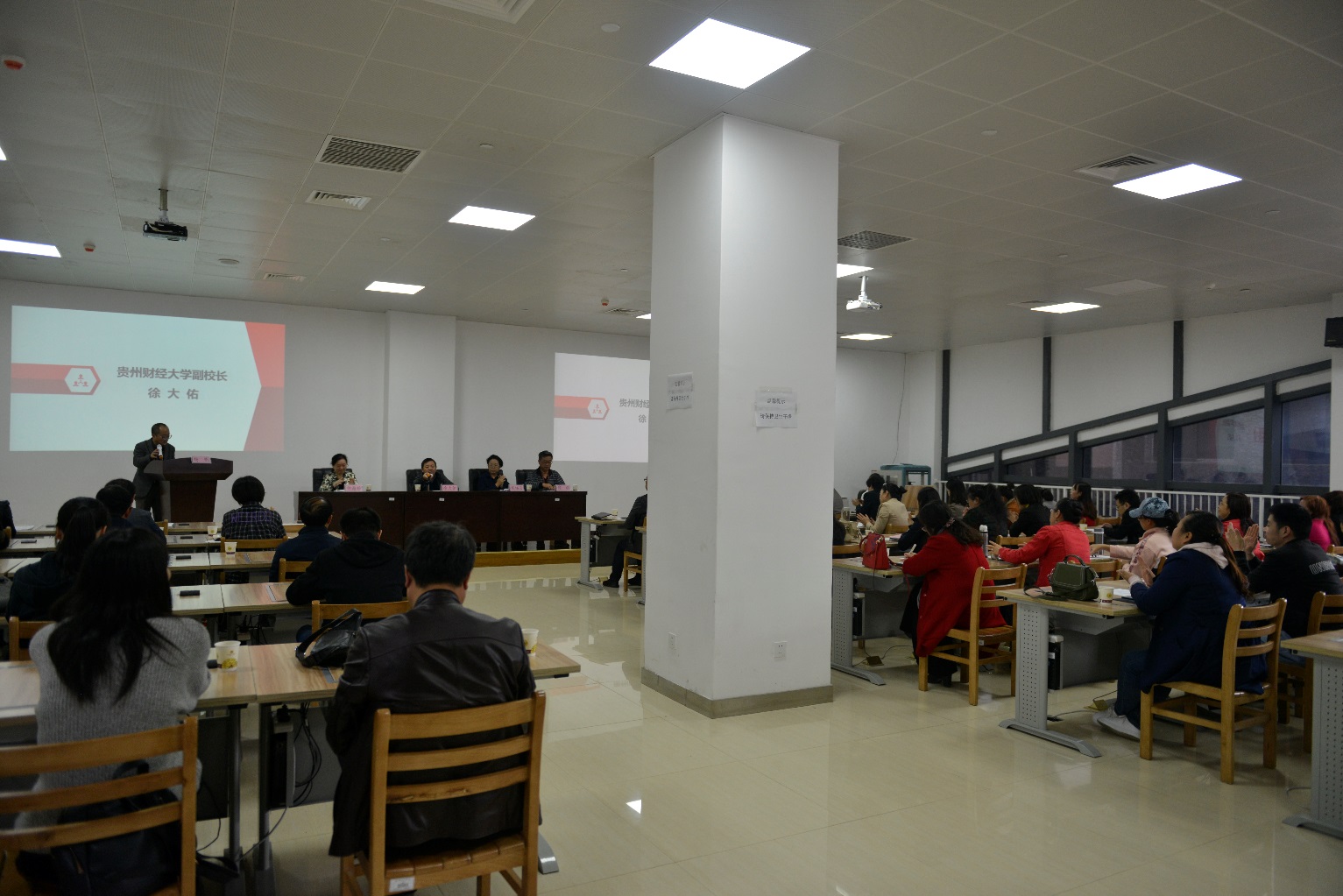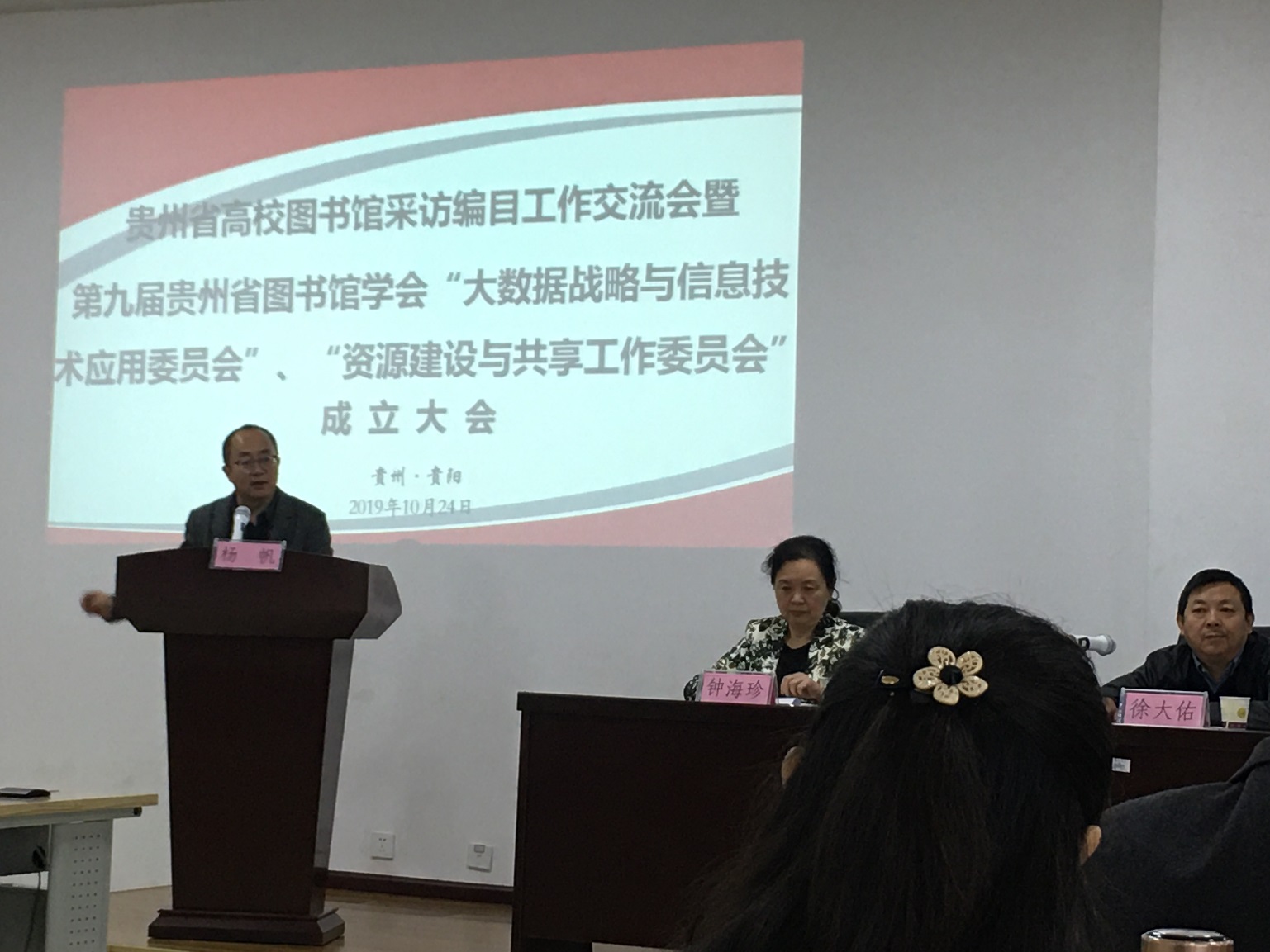 会议由贵州财经大学图书馆、票据博物馆馆长杨帆主持,首先由贵州财经大学副校长徐大佑、贵州财经大学图书馆党总支书记顾明向与会人员致欢迎词,贵州省图书馆学会秘书长钟海珍宣读“大数据战略与信息技术应用委员会”、“资源建设与共享工作委员会”成立批文,再由杨帆馆长宣读“大数据战略与信息技术应用委员会”、“资源建设与共享工作委员会”人员名单并颁发聘书,届此,“大数据战略与信息技术应用委员会”、“资源建设与共享工作委员会”宣告正式成立。