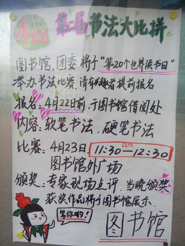 2015年4.23世界读书日系列活动之第二届书法大比拼宣传海报