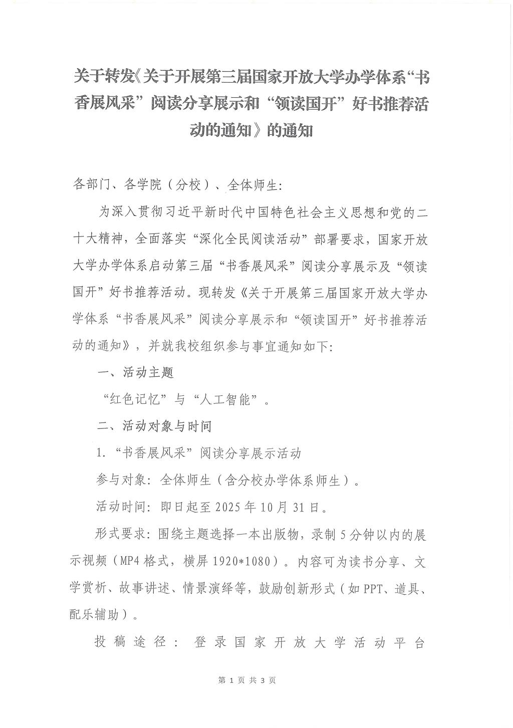 关于转发《关于开展第三届国家开放大学办学体系“书香展风采”阅读分享展示和“领读国开”好书推荐活动的通知》的通知
