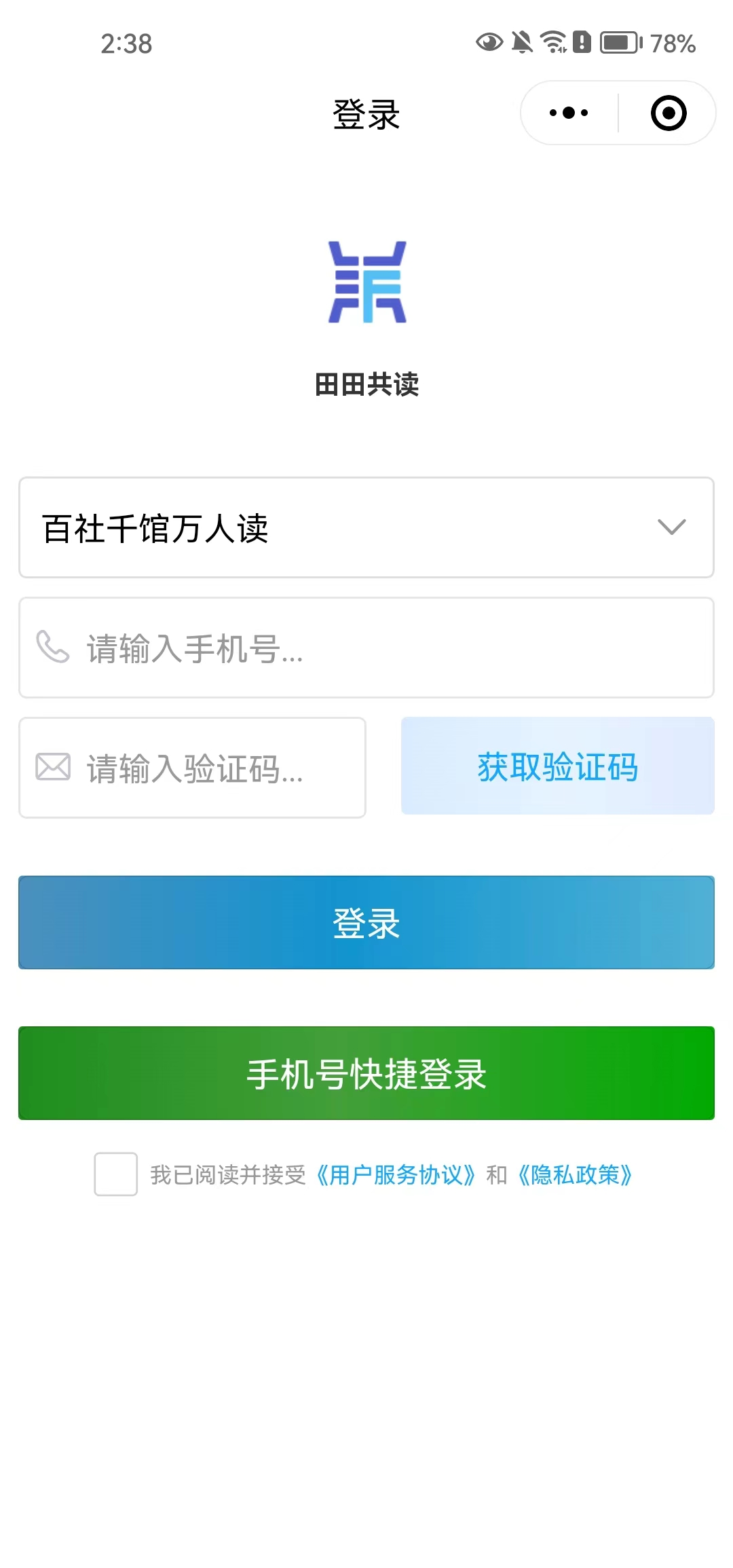 (2)输⼊选择机构(百社千馆万⼈读),输⼊⼿机号码,获取验证码登⼊。