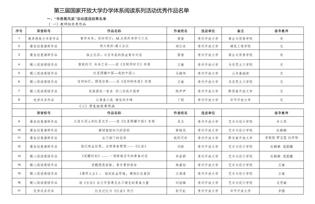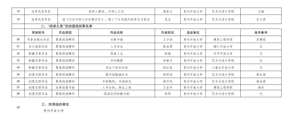 我校在第三届国家开放大学系列阅读活动中获佳绩“领读国开”好书推荐、"书香展风采"阅读分享"阅读之美"创意摄影大赛等活动中精心完成52件作品目前贵州开放大学体系共喜获29个奖项。