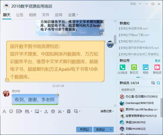 为让教职工熟悉使用图书馆数字资源,助力他们教学科研,图书馆每年都会对新进校教职工进行图书馆资源利用培训。2018年新进教职工图书馆资源利用培训采取网络培训方式进行。建立了培训专用QQ群,以PPT和视频结合的形式,于2018年11月30日完成此项工作。