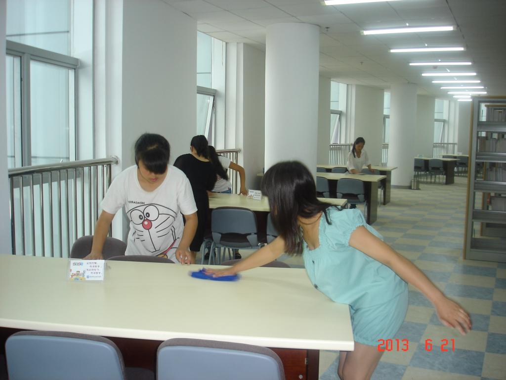 在图书馆工作人员的组织带领下,同学们洗净拧干抹布、拖把,将书库、阅览室卫生进行了一次认真彻底地打扫,为师生在图书馆借阅图书和学习交流创造了清洁、舒适优美的环境,为校园文化生活增添了靓丽宜人的景色。