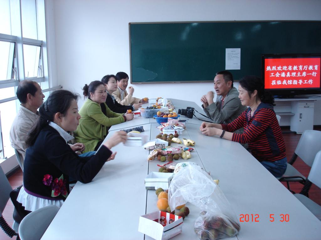 2012年5月30日下午,贵州省教育厅教育工会潘真理副主席一行莅临贵州广播电视大学“职工书屋”指导工作。贵州广播电视大学工会主席李鸣、贵州广播电视大学图书馆馆长郭云莹及图书馆部分工作人员陪同其参观“职工书屋”并就“职工书屋”活动的开展进行了座谈。
