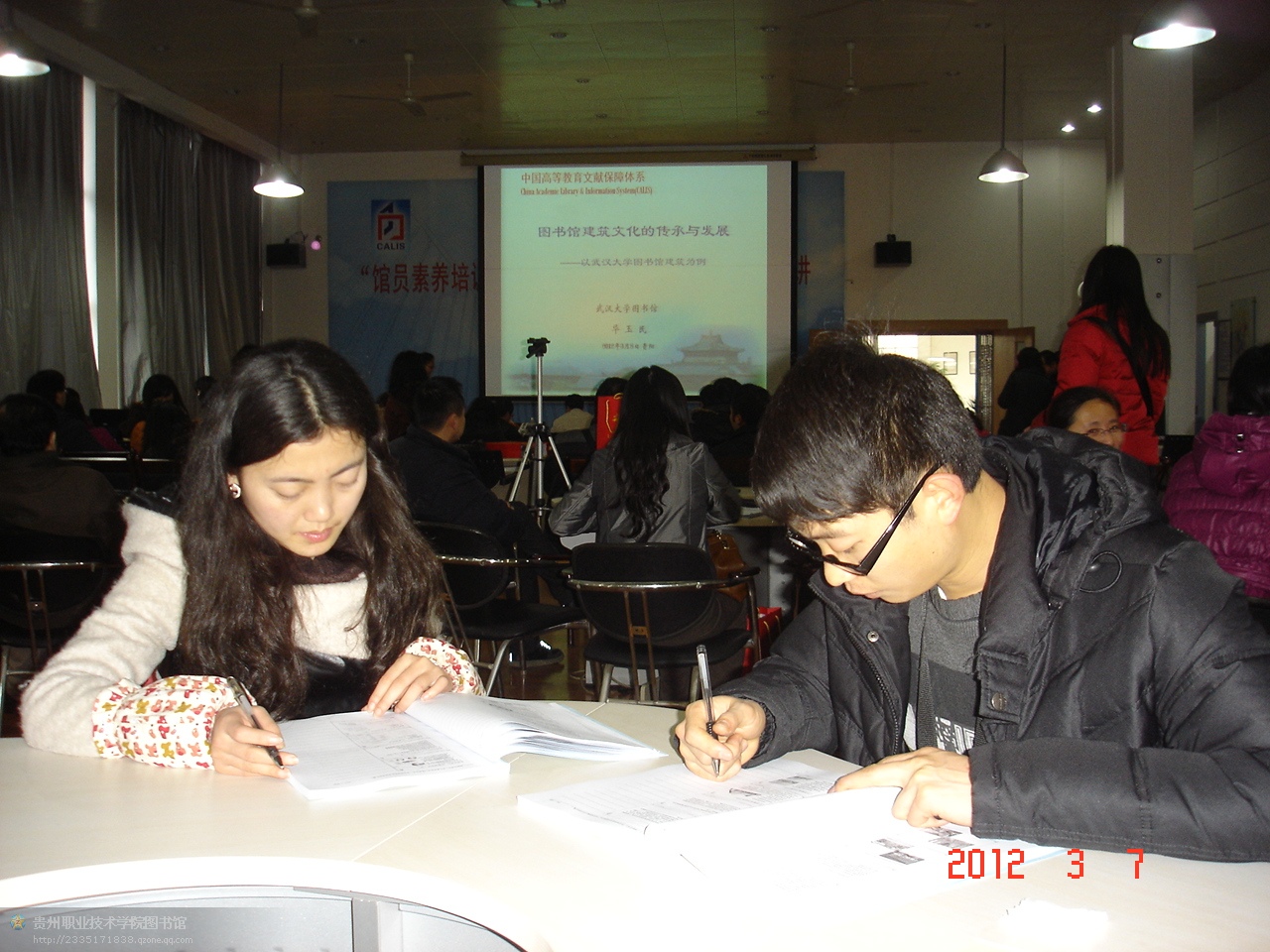 2012年3月8日至3月9日,贵州广播电视大学图书馆派出馆员梁逶、刘莉娜、李光华参加在贵州师范大学图书馆举办的CALIS三期建设项目“馆员素养培训与资格认证”项目西部地区专家巡讲。